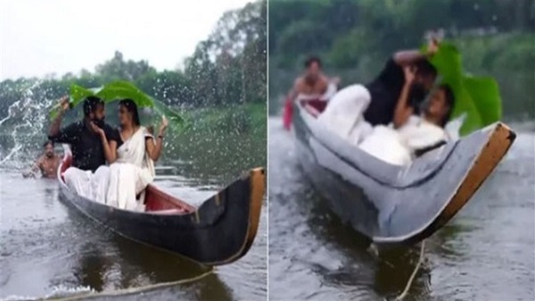 ভারতের তামিলনাড়ুতে এমন ঘটনা ঘটেছে। রাজ্যের চওড়া একটি নদীতে সরু নৌকায় বসে রয়েছেন তরুণ–তরুণী। মেয়েটির পরনে সাদা শাড়ি। আর ছেলেটি পরেছেন মেরুন পাঞ্জাবি, সঙ্গে সাদা ধুতি। দু’জনেই আবার কায়দা করে একফালি কলাপাতা ধরেছেন নিজেদের মাথায়। আশেপাশে অত্যাধুনিক ক্যামেরা হাতে হাজির বেশ কয়েকজন ফটোগ্রাফার।