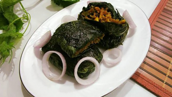 উপকরণ: চ্যাপা শুঁটকি ৭টি, পেঁয়াজ কুচি আধা কাপ, রসুন কুচি আধা কাপ, মরিচ ৭টি, হলুদ ও ধনে গুঁড়া স্বাদমতো, আস্ত কাঁচা মরিচ কয়েকটি, শর্ষের তেল পরিমাণমতো, কুমড়া বা লাউ পাতা ১৪টি ও লবণ স্বাদমতো।