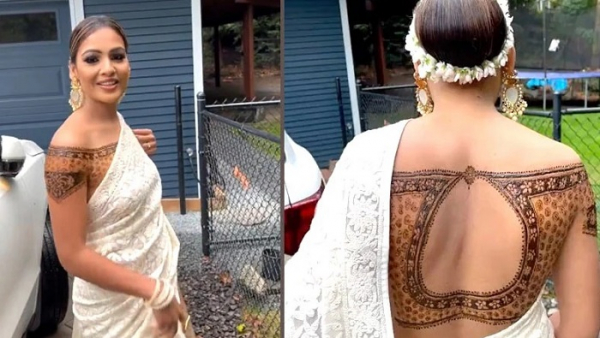 সাদা শাড়ি, মেহেদি দিয়ে ব্লাউজ পরে তাক লাগালেন তরুণী