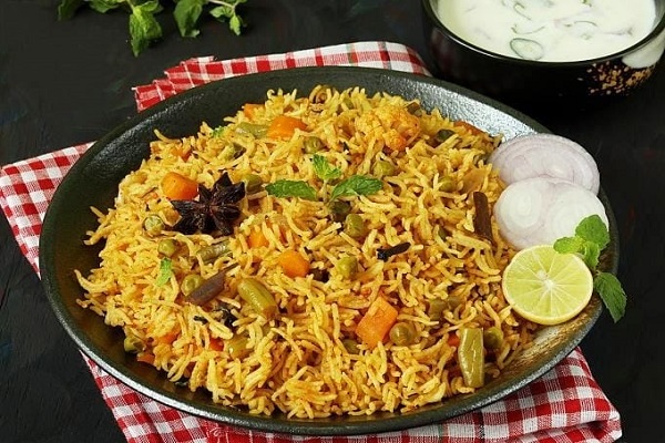 উপকরণ: পোলাও চাল এক কাপ, টকদই আধা কাপ, পেঁয়াজ কুচি এক কাপ, আদা-রসুন কুচি এক টেবিল চামচ, ফুলকপি ১/৪ কাপ, বিনস ১/৪ কাপ, গাজর কুচি ১/৪ কাপ, আলু ১/৪ কাপ, পুদিনা পাতা কুচি ১/৪ কাপ, ধনিয়া পাতা কুচি ১/৪ কাপ, তেল পরিমাণ মতো, লবণ পরিমাণ মতো, জল পরিমাণ মতো, জিরা এক চা চামচ, লবঙ্গ ৪টি, দারুচিনি দুইটি, তেজপাতা একটি, গোলমরিচ ৮ থেকে ১০ টি, মরিচের গুঁড়া আধা চা চামচ, ধনিয়া গুঁড়া এক টেবিল চামচ, বিরিয়ানি মশলা দুই টেবিল চামচ।