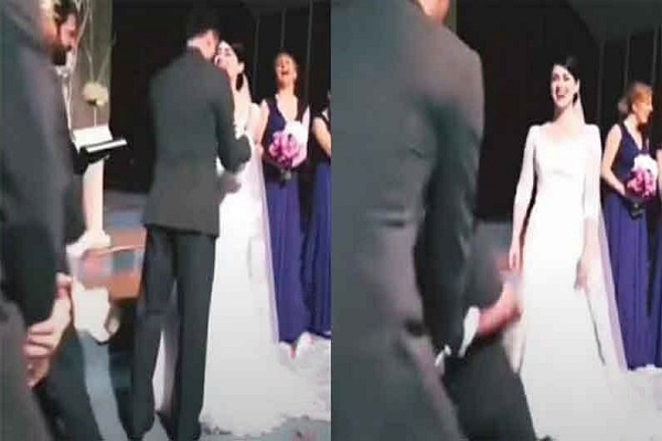 সেখানে দেখা যায়, বিয়ের মঞ্চে সাদা গাউন পরে দাঁড়িয়ে আছেন কনে। পাশে তার সঙ্গীরা। বরের বন্ধুরাও সেখানে উপস্থিত। এরপর প্রথা মেনে নববধূর ঠোঁটে চুমু খেলেন বর। এরপরেই ঘটে মজার ঘটনা। স্ত্রীকে চুমু খেয়েই জ্ঞান হারান বর!