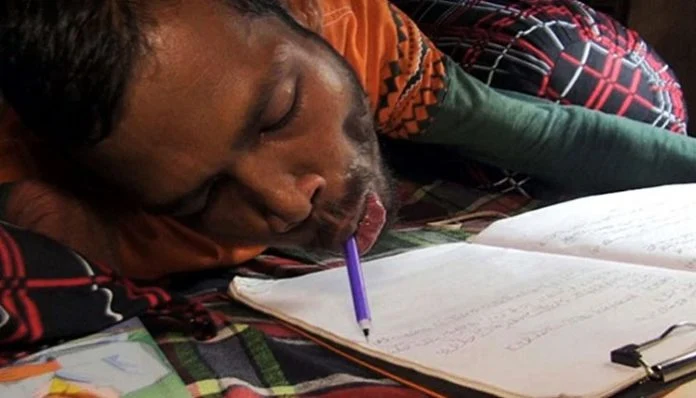 নিজ বিছানাকে শ্রেণিকক্ষ বানিয়ে দিনরাত মুখে কাঠি নিয়ে বইয়ের পৃষ্ঠা উল্টিয়ে চলত পড়াশোনা। শুধু তাই নয়, মুখ দিয়ে মোবাইল ফোন চালিয়ে অনলাইনে ক্লাসও করত। মুখে কাঠি নিয়ে কিবোর্ডে আঁচড় ফেলে কম্পিউটারে টাইপ করত হরহামেশাই।