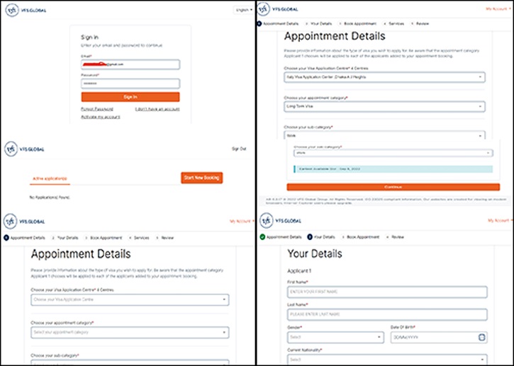 পরে যে পেজটি আসবে সেখানে Start New Booking -এ ক্লিক করলে Appointment Details পেজটি আসবে। সেখানে Choose your Visa Application Centre*4 Centres এ ক্লিক করে Italy Visa Application Center, Dhaka-A J Heights সিলেক্ট করলেই নিচের ঘরগুলো অটোমেটিক পূরণ হবে।