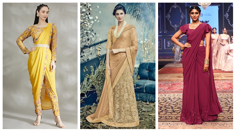 >> প্রি-স্টিচড গাউন স্টাইল করতে চাইলে আগে একটি আকর্ষনীয় ব্লাউজ লাগবে। শাড়ির কুঁচি প্লিট করে একপাশে টেনে আটকে দিন। কুঁচিগুলো যেন একপাশে হয়, এটা নিশ্চিত করুন। এক্ষেত্রে সিকুইন, নেট, জ্যাকেট-স্টাইল বা পেপ্লাম বডিসের মতো অলঙ্করণগুলো বিবেচনা করা যেতে পারে।